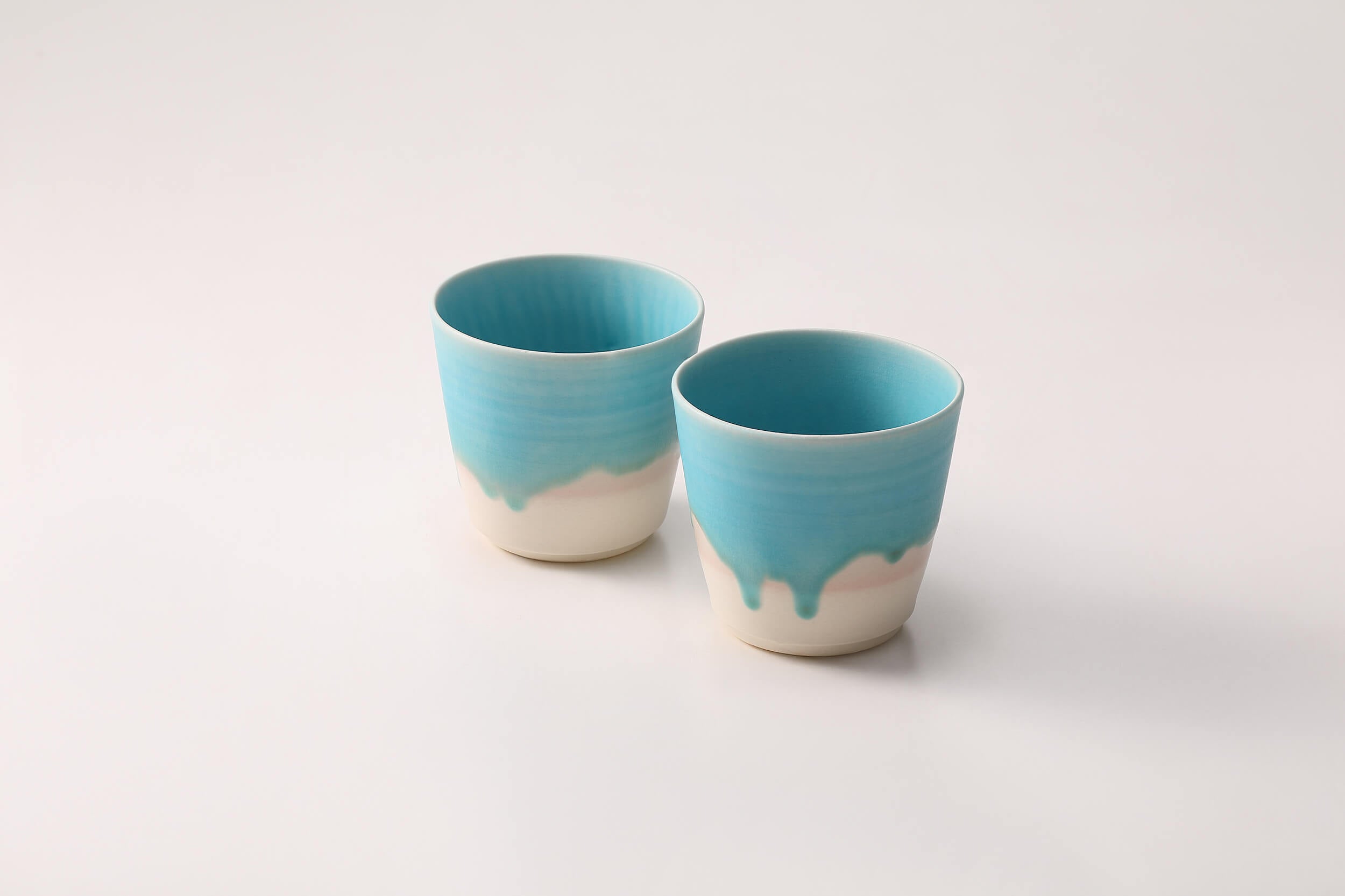 以蓝色釉料为核心的系列作品。杯子类可以欣赏到不同角度下瓷釉的色彩,盘子则可以欣赏到在盘子中央积瓷釉产生的深海般的颜色和渐变。在餐桌上演绎出清爽的海蓝色景象。