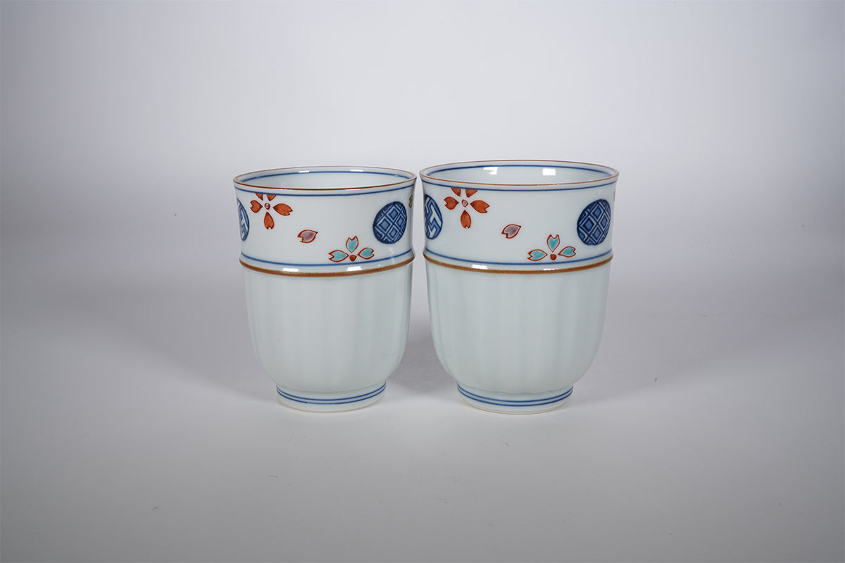 色とりどりの桜と染付で丸く描かれた吉祥紋が可愛らしい器です。